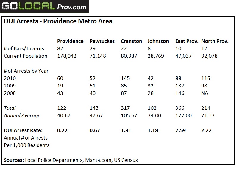 In one year, 2009, Providence had as few as 19 DUI arrests while communities like North Providence and East Providence racked up 98 and 132, respectively.