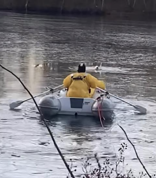 Two firefighters got in their boat, and worked feverishly to break the ice covering the pond to reach the animal, say police.