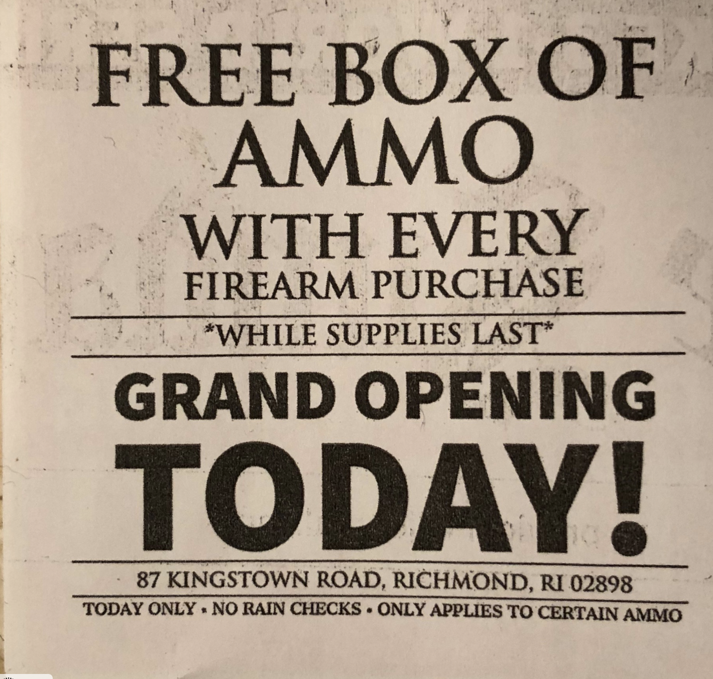 Free Ammo offer on the back of the stickerThe Providence Journal on Sunday featured a front-page ad for The Sporting Shoppe — a gun store that this month features sales on rifles and handguns and a “special offer” of $25 off a purchase of $500 on a handgun.