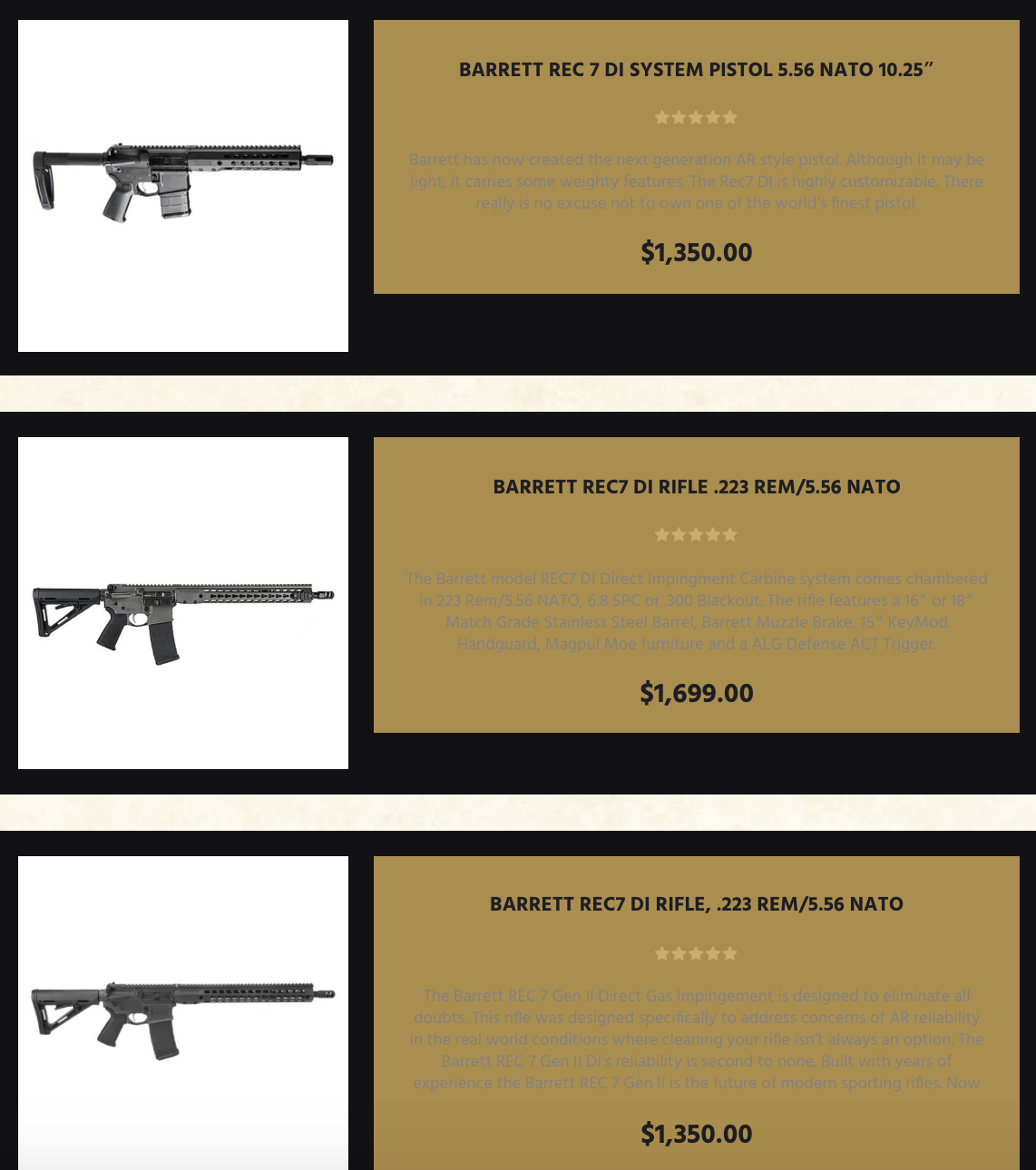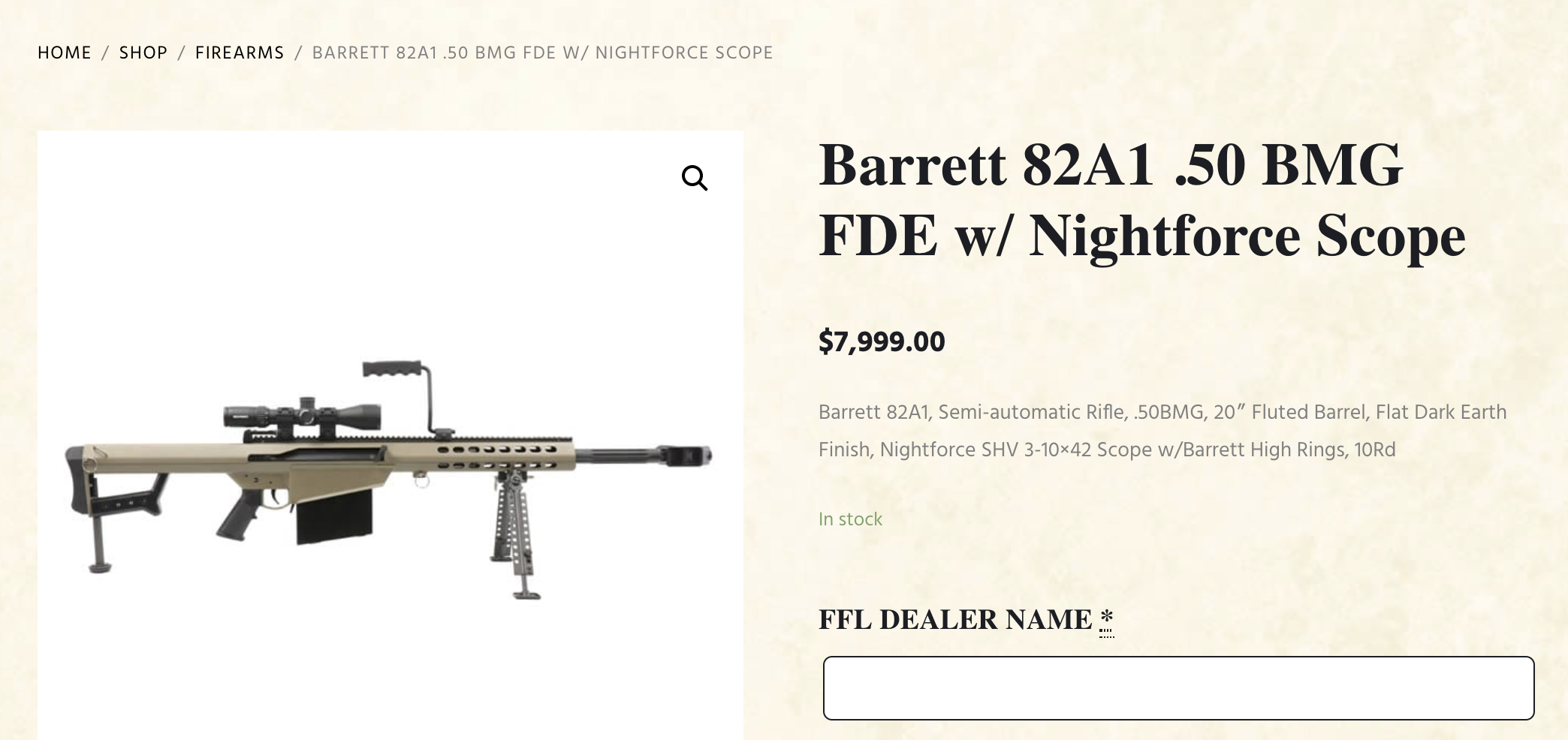 Another firearm featured is the "Barrett 82A1 .50 BMG FDE w/ Nightforce Scope at $7,999.00 -- Semi-automatic Rifle, .50BMG, 20″ Fluted Barrel, Flat Dark Earth Finish, Nightforce SHV 3-10×42 Scope w/Barrett High Rings, 10Rd."