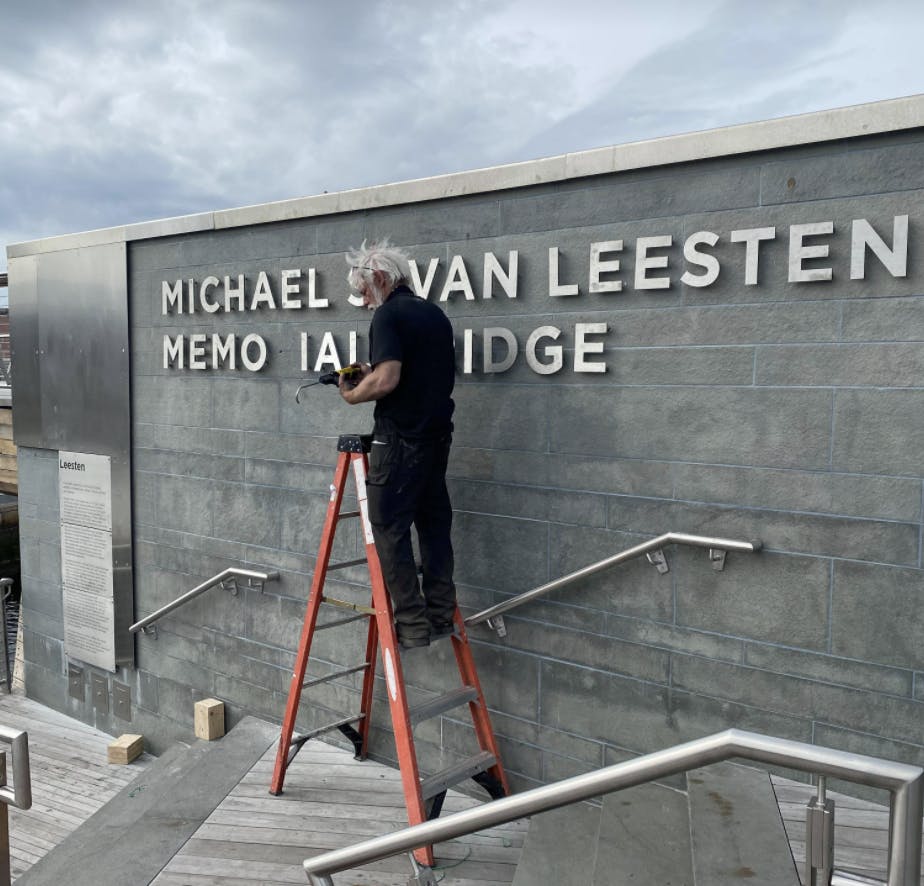 On Wednesday, his daughter Jill Van Leesten was on-site to watch the installation of the lettering.