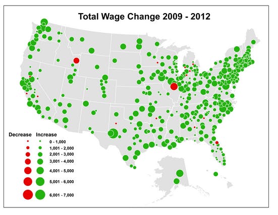 Richard Florida, who penned the wage increase article in The Atlantic Cities, noted that nearly all U.S. metro areas - 96 percent of them - saw some increase in average annual wages over the years looked at.