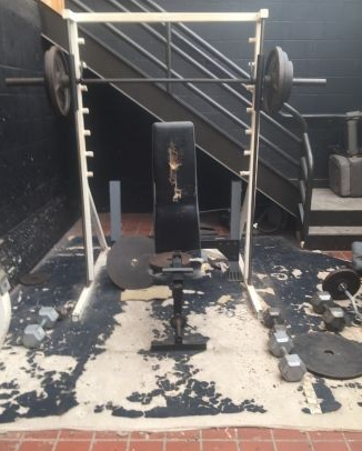 Torn and worn down workout equipment is shown in this picture. Old and rusty weights are all over the gym with no organization.