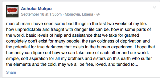 Mukpo had been posted on his Facebook page about his experience in Liberia, including the post below on Setpember 18.