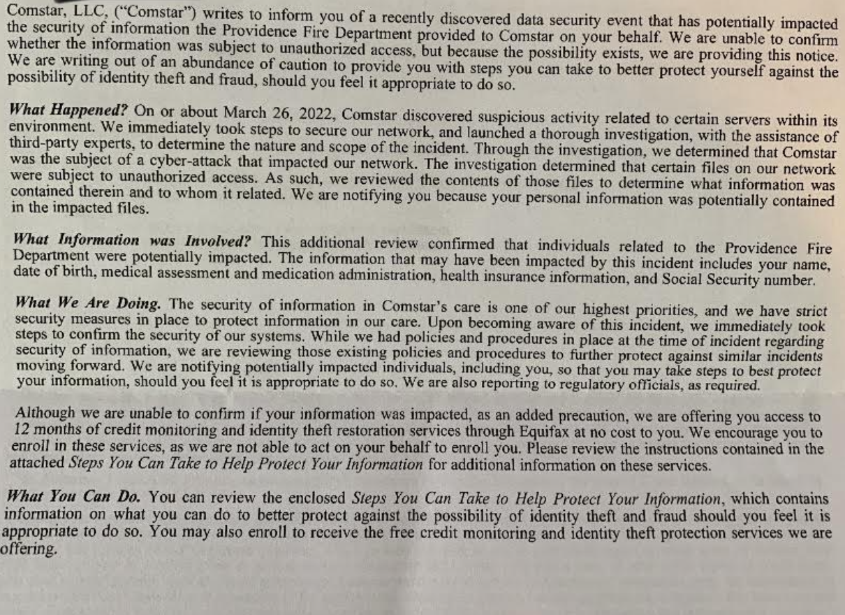 “Comstar, LLC (“Comstar”) writes to inform you of a recently discovered data security event that has potentially impacted the security of information the Providence Fire Department provided to Comstar on your behalf,” wrote Comstar to their letter.