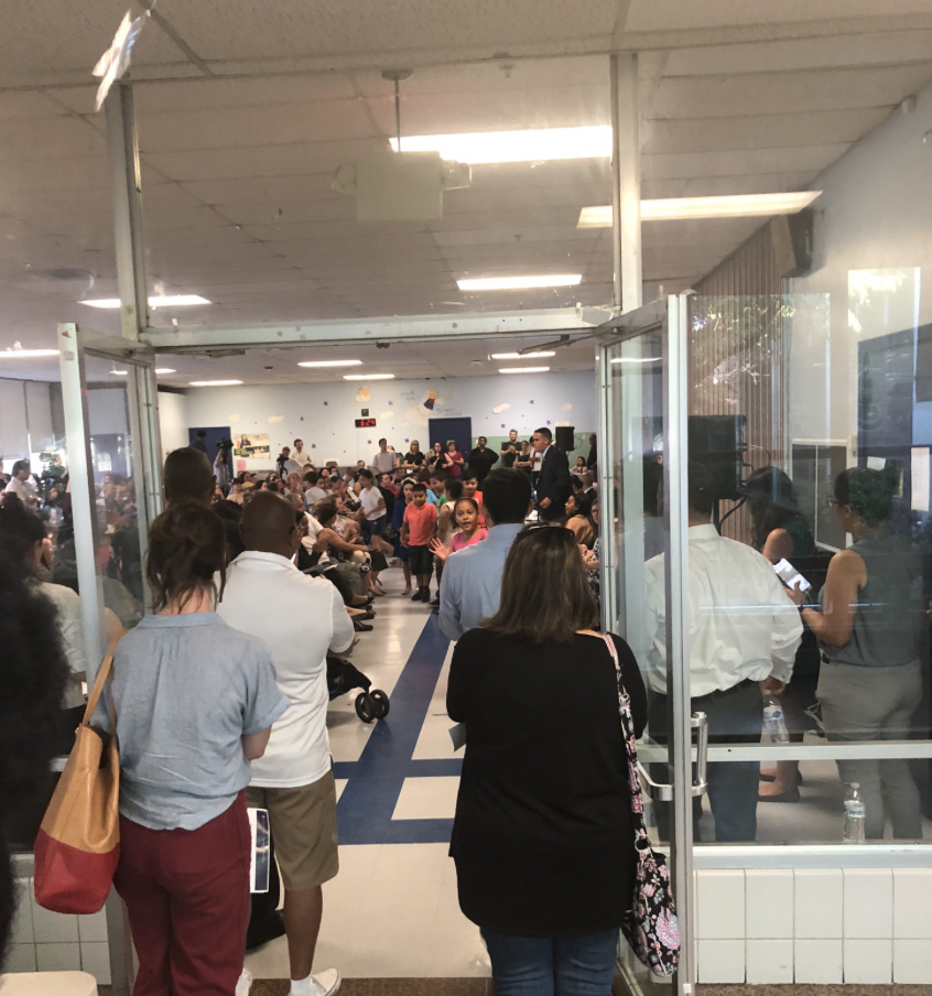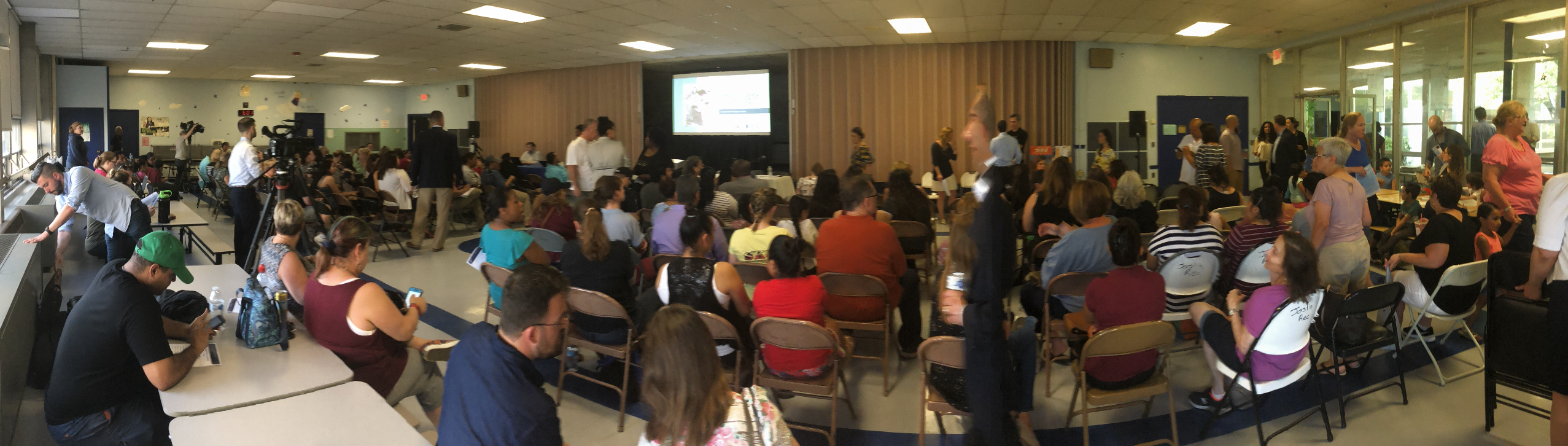 Attendees in the crowd of approximately 150 could be seen waving the meeting handout as fans, trying to stay cool in the small cafeteria of the William D’Abate School in Olneyville.