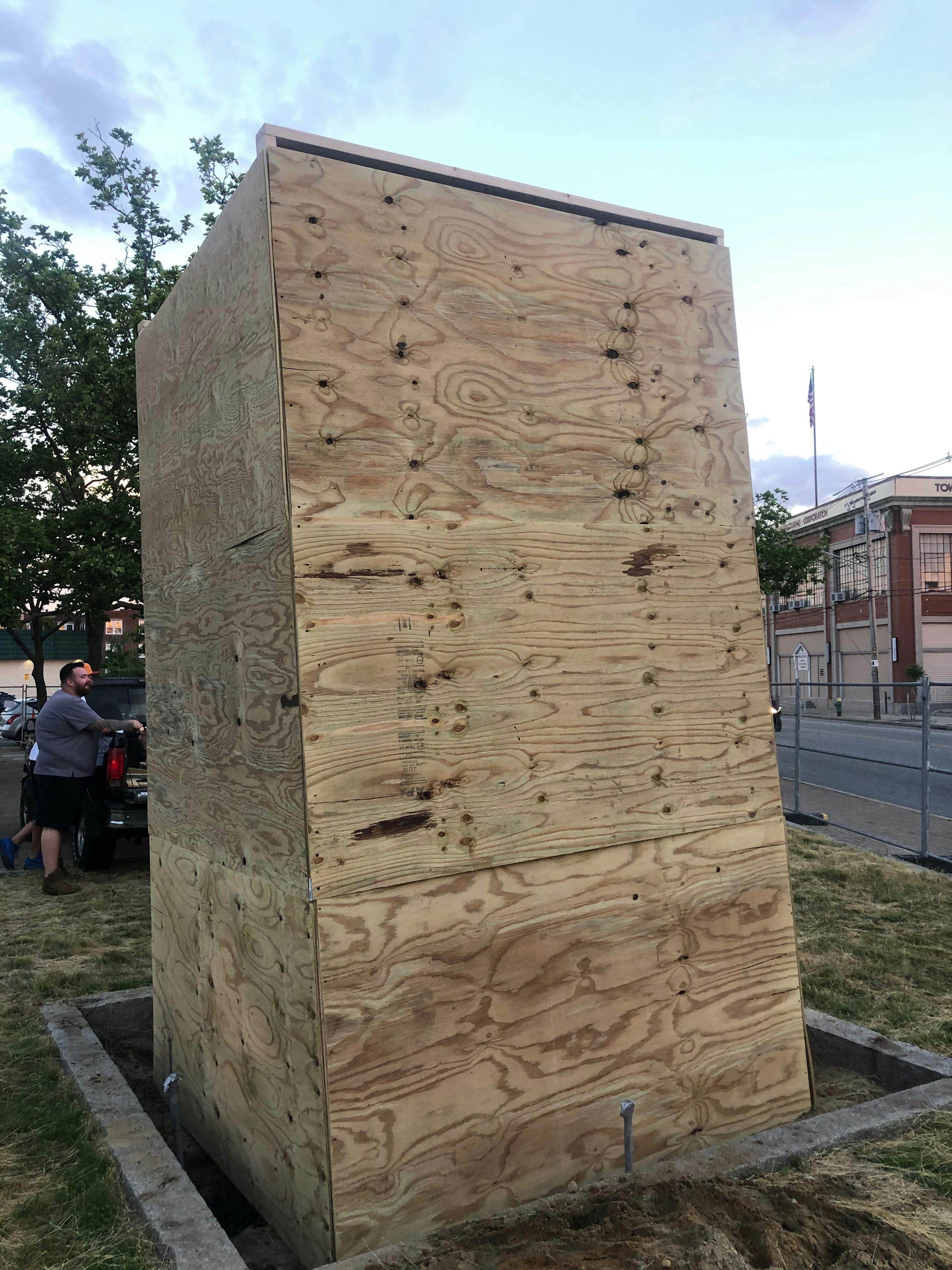 According to Taylor, he covered the statue in Columbus Square in a wooden box, as the "city is slated to make significant improvements, including adding decorative lighting," he said. There is currently fending enclosing the square.