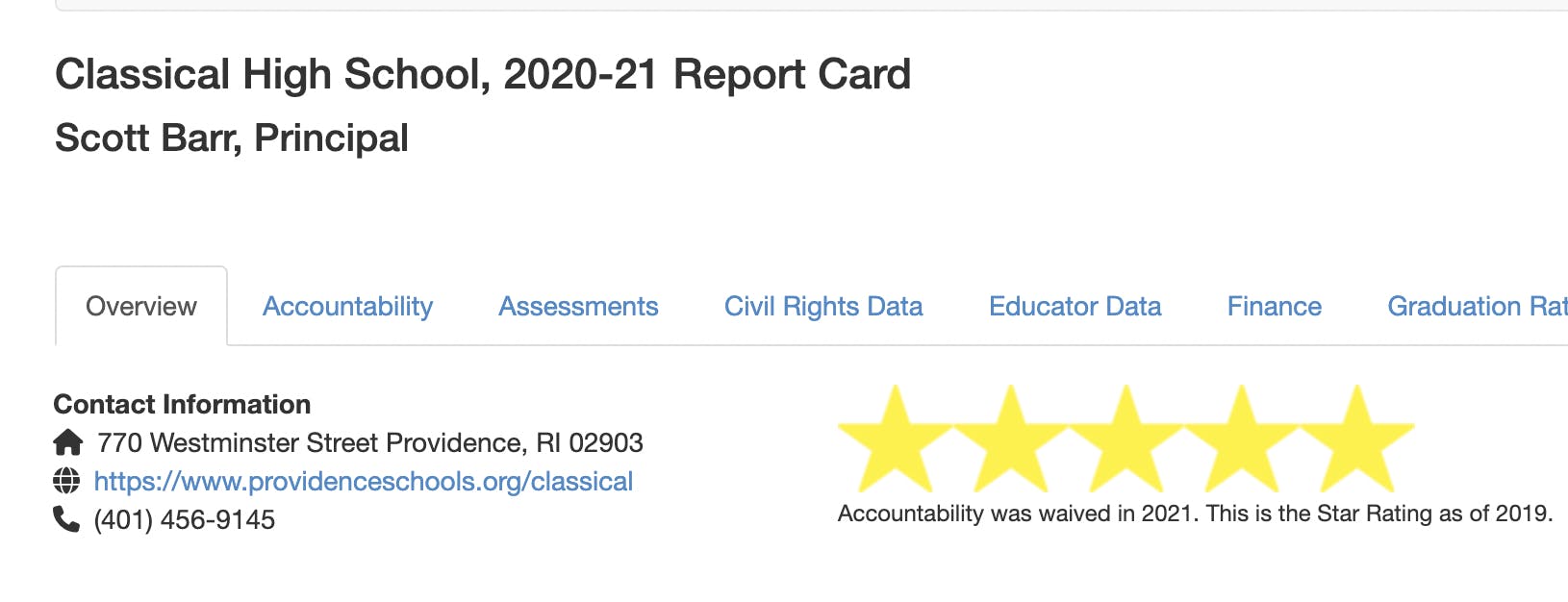 "Classical High School’s federally mandated Report Card shows that, overall, Classical continues to be an exemplary high school with most of its indicators either being 4 or 5 stars. Students and families can be confident that Classical remains an outstanding institution, and RIDE and PPSD will continue to support the school in offering every student a high-quality education," said Infante-Green.