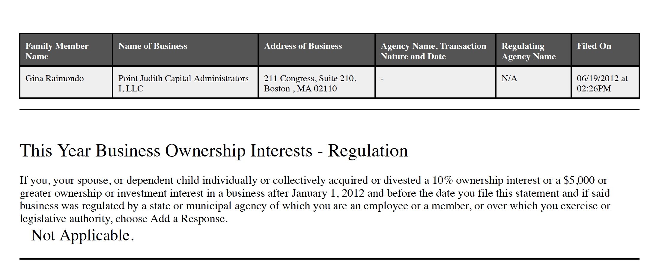 Raimondo's press office refused to respond to a half dozen calls and emails regarding questions and potential conflicts associated with the appointment of Martirano. Shortly after Raimondo was elected General Treasurer, the Rhode Island-based company move to Boston.