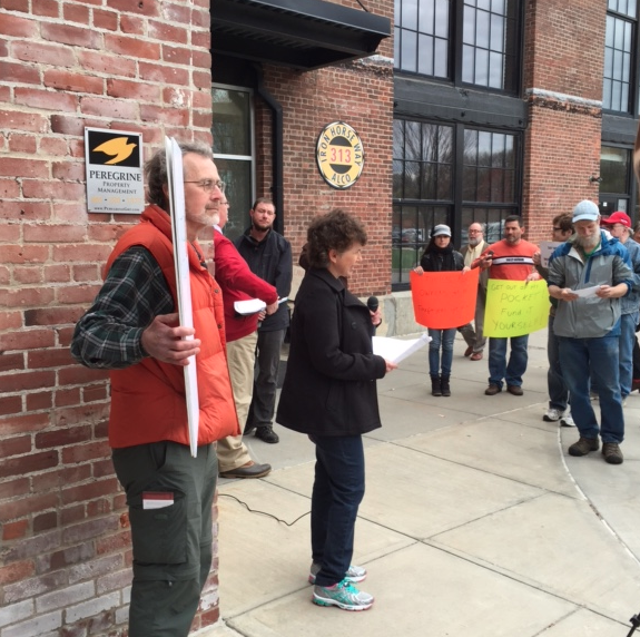 A speaking program took place prior to the meeting on Monday by opponentsPrior to the meeting, opponents to the stadium deal turned out for a speaking program held outside the Commerce RI offices.