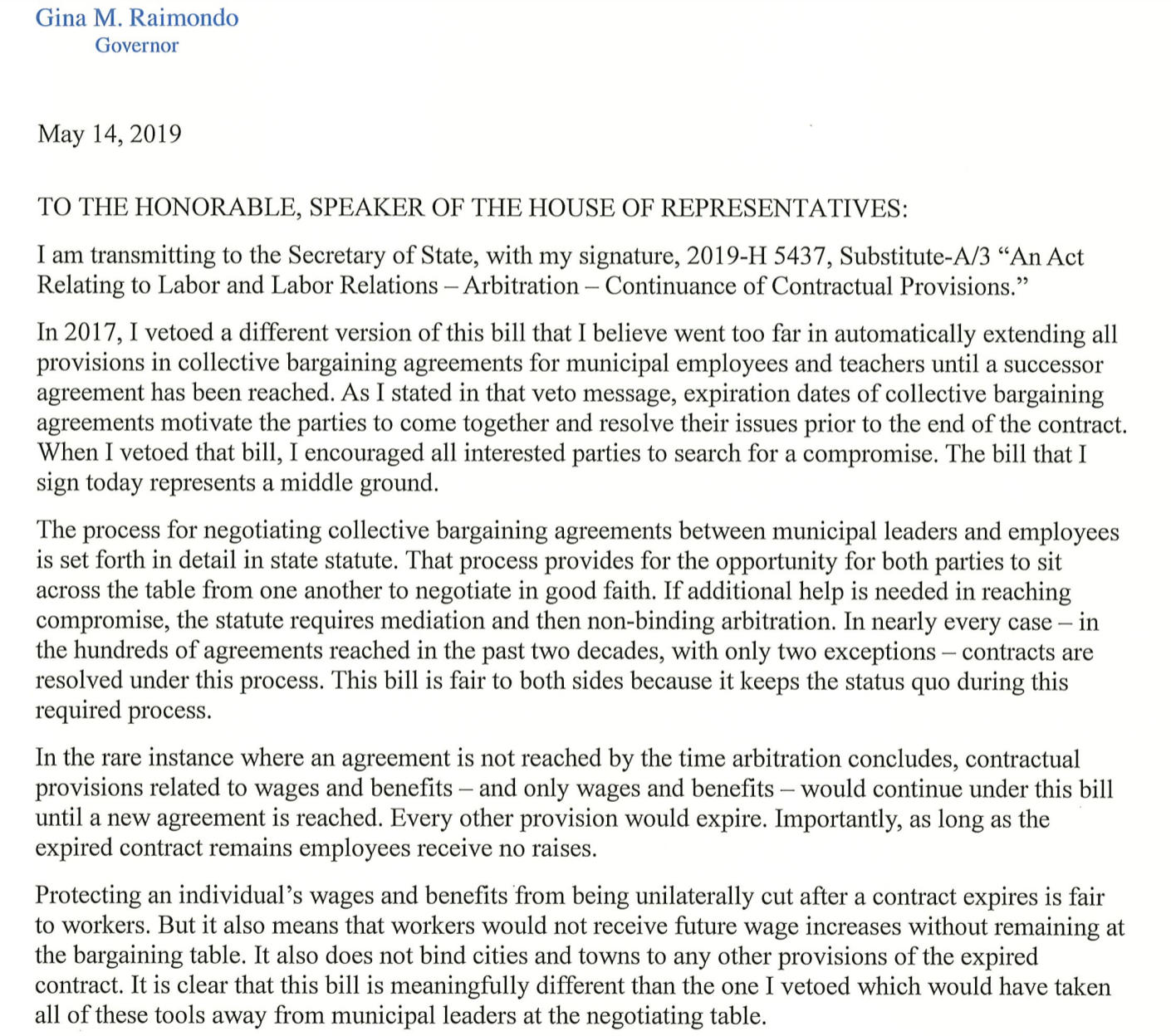 Raimondo Signs Evergreen Contract Bill Into Law, Transmits Firefighter OT Bill Without Signature