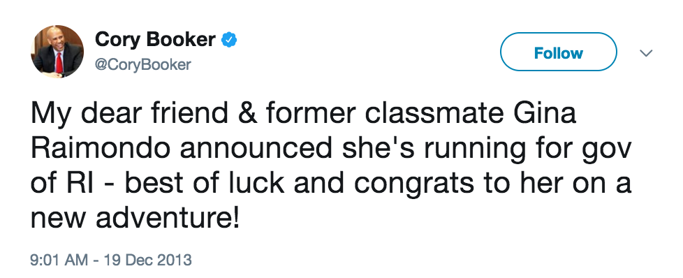 Booker and Raimondo were college classmates and have been strong supporters of one another. And, Pryor -- who drafted the PawSox’s $83 million financing scheme -- worked as head of economic development for Booker when he was Mayor of Newark New Jersey.