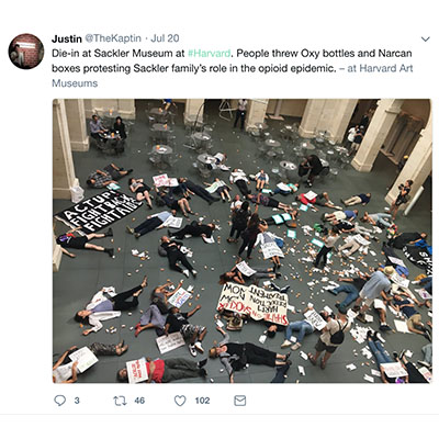 The "die-in" inside Sackler Museum in protest of its ties to a family the demonstrators say profited off the opioid crisis. "Protest underway at Harvard’s Sackler Museum over the family’s role in the opioid epidemic. Activists join medical students from @harvardmed in chanting “people over profits” and “shame on Sacklers.” Tweeted one of the protestors.