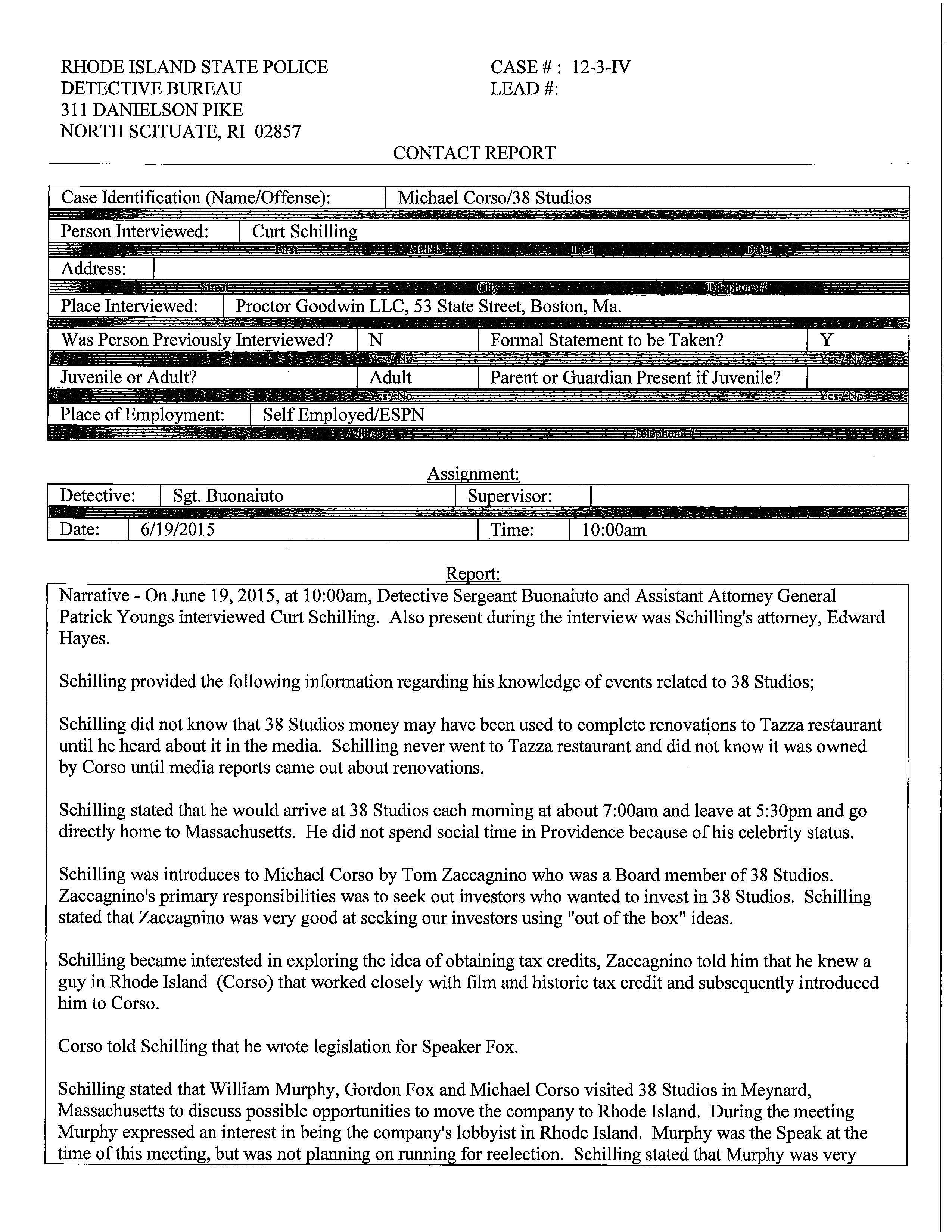 READ Curt Schilling's RI State Police Interview Friday, March 03, 2017 GoLocalProv News Team READ Curt Schilling's RI State Police Interview 38 Studios Founder Curt SchillingREAD Curt Schilling's RI State Police Interview regarding 38 Studios. RISP Interview: Curt Schilling Enjoy this post? Share it with others.