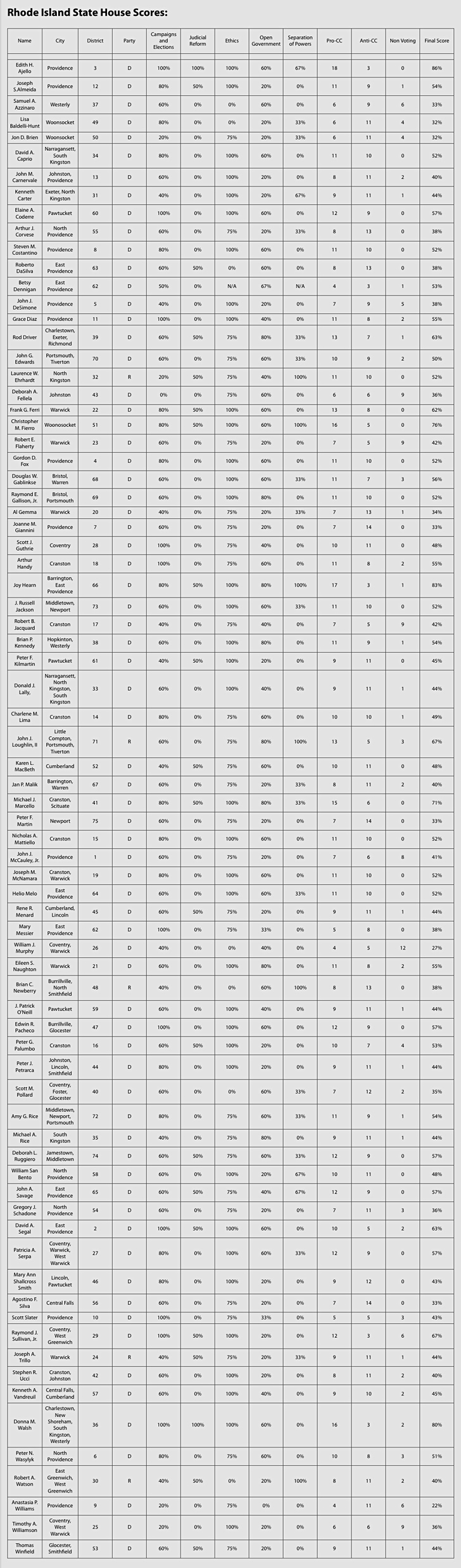 Common Cause, a government watchdog group, has given state lawmakers low marks in its annual scorecard of how they voted on ethics, judicial reform, campaign and elections, separation of powers, and open government. Below is a listing of all state reps and senators and how they scored. Click here for more information.