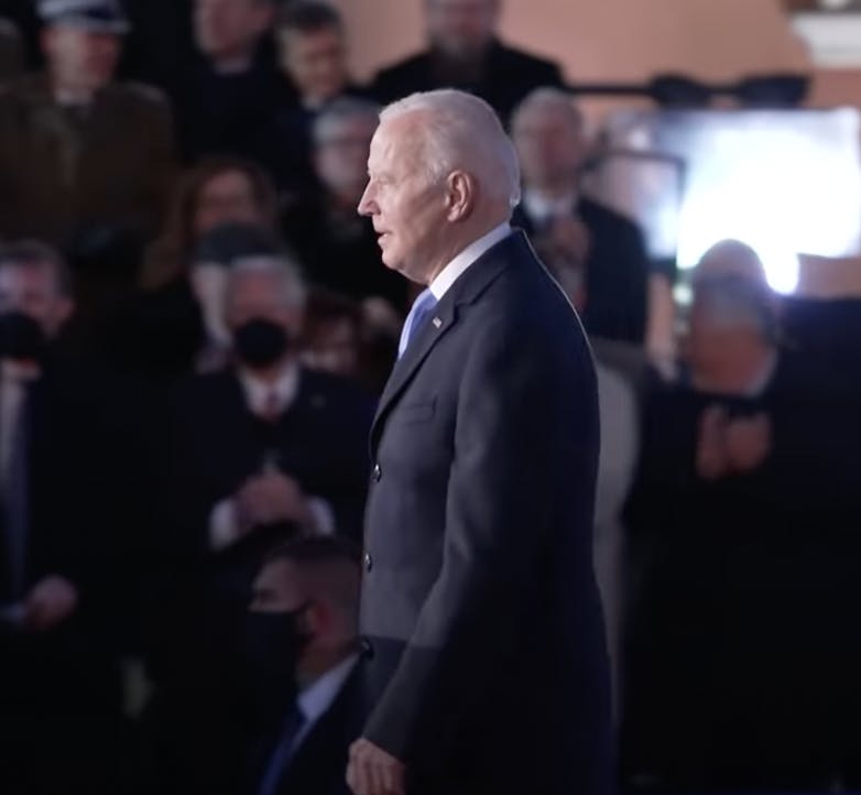Today, let us now have that faith again. Let us resolve to put the strength of democracies into action to thwart the denigns [sic] of our — the designs of autocracy. Let us remember that the test of this moment is the test of all time.