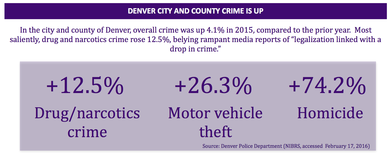 • In 2015, drug crimes rose 12.5% in the city and county of Denver, and homicides were up over 74%.
