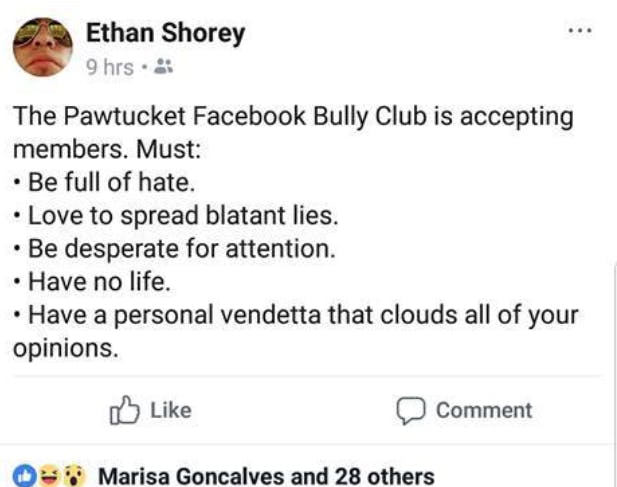 "The Pawtucket Facebook Bully Club is accepting members," wrote Shorey on Facebook. "Must be full of hate; love to spread blatant lies; be desperate for attention; have no life; have a personal vendetta that clouds of all your opinions."
