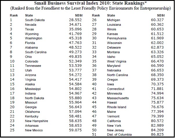 The 15th annual Small Business Survival Index, produced by the Small Business and Entrepreneurship Council, ranks each state for how conducive its laws, regulations, and taxes are to entrepreneurship. The ranking system compares all 50 states and the District of Columbia on a set of 38 indicators, including a variety of tax rates, health care regulation, crime rates, worker benefits, and education reform. (Click here to read the study and here to see the interactive map.)