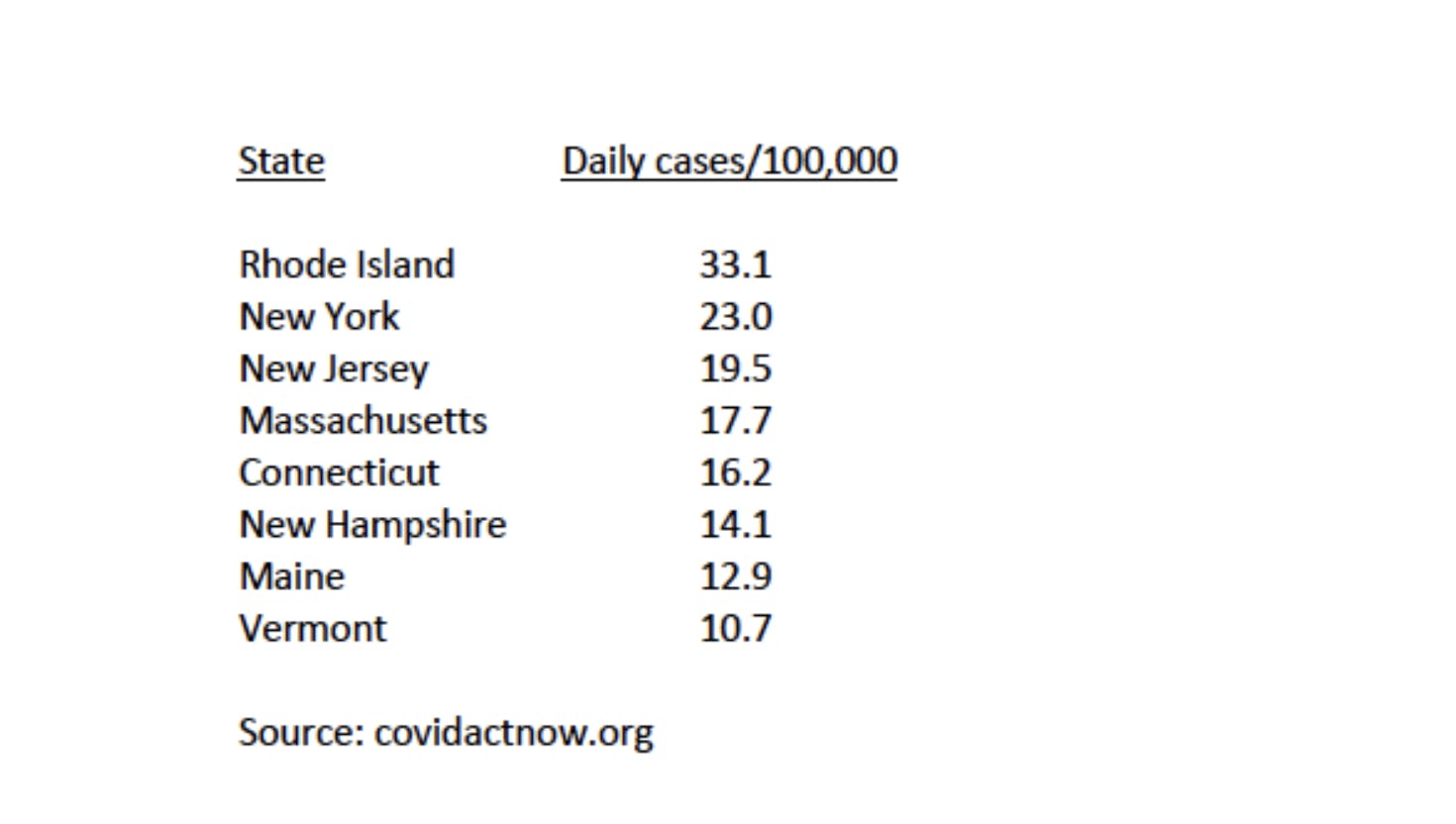 This is not just in the past. As seems to distressingly often be the case, Rhode Island again has the worst performances of all states in the northeast, with the highest rate of new COVID cases. We are the only state in the northeast ranked “Very High” risk level by covidactnow.org.