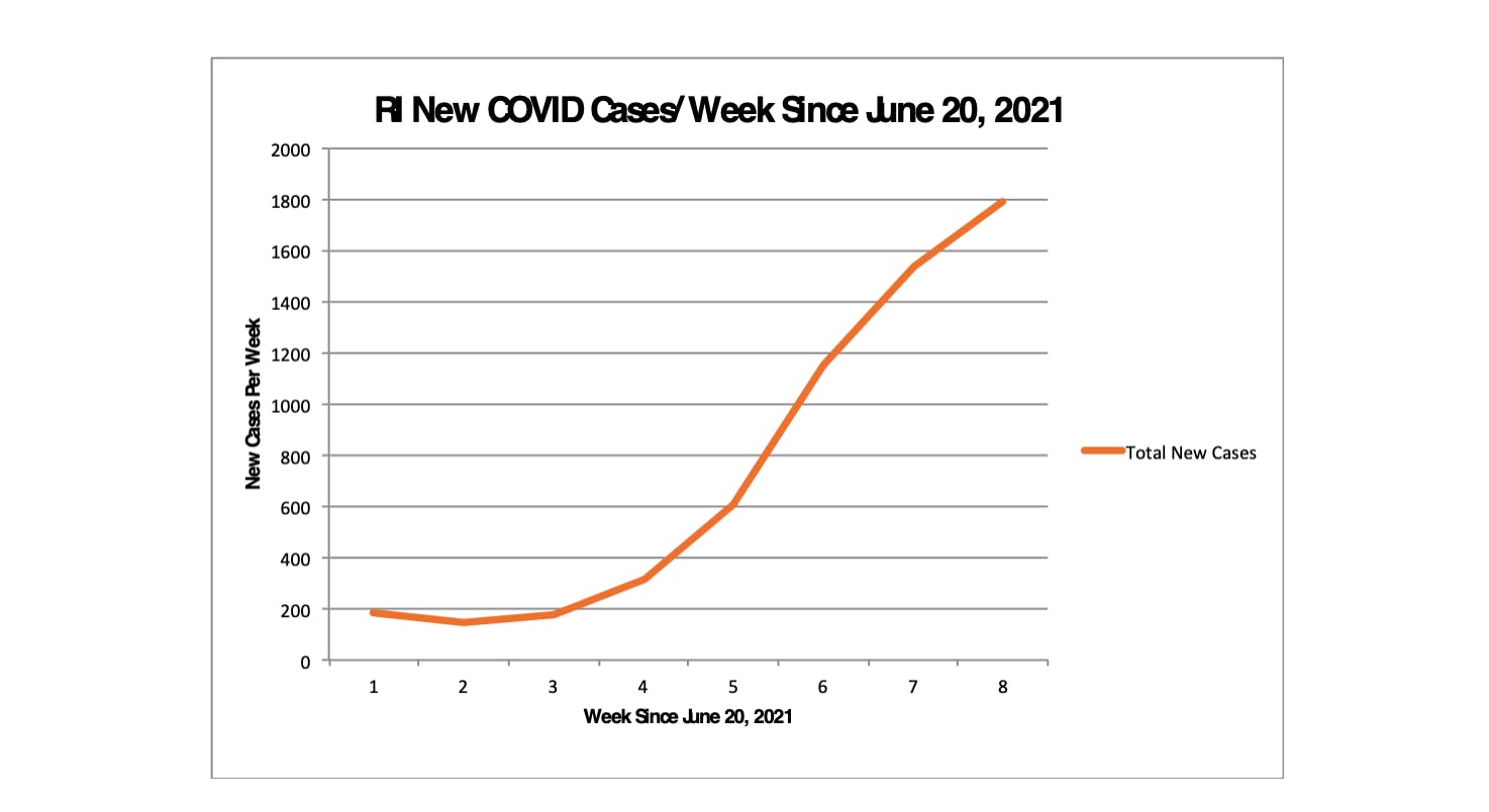 Rhode Island’s COVID numbers are bad across the board. Since mid-June when the Delta variant hit us in earnest, new weekly COVID cases have increased nearly 10-fold from 187 to 1,786 - a 1,000% increase.