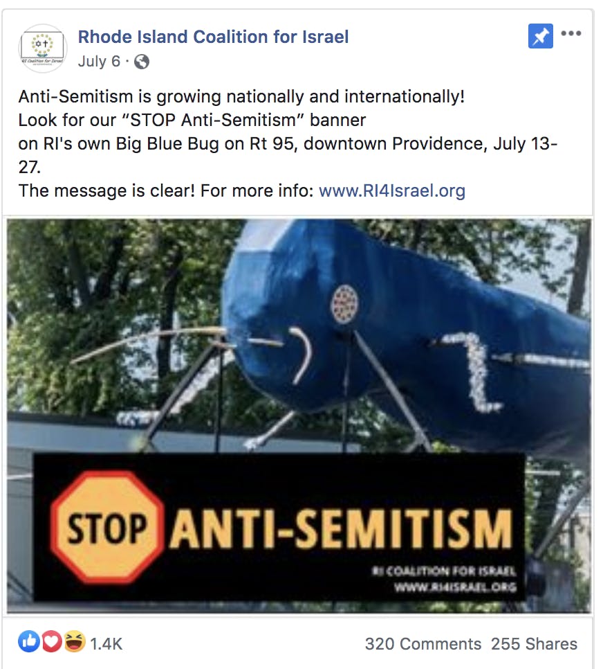 "For three weeks this summer, the iconic Blue Bug 'Nibbles Woodaway' on Rt. 95 in Providence hosted a banner reading ‘STOP ANTI-SEMITISM,’” said the Coalition in a press statement.
