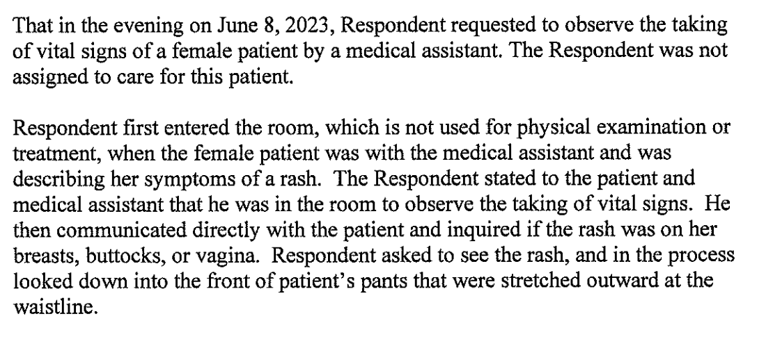 “Subsequently, the assigned treatment provider, a staff APRN, assessed and treated the patient. The APRN communicated to the patient that the visit was almost over and then left the room. The Respondent, without direction to do so, then entered the patient’s room for a third encounter with the patient. The Respondent closed the door and directed the patient to allow him to observe how close the rash was to the patient’s nipples, fully exposing the patient’s breast. The Respondent then asked to see the patient’s exposed buttocks and unclothed vulva area. The Respondent observed these areas and touched them.”