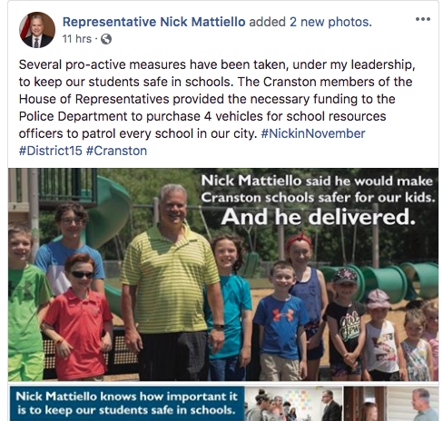 "Several pro-active measures have been taken, under my leadership, to keep our students safe in schools. The Cranston members of the House of Representatives provided the necessary funding to the Police Department to purchase 4 vehicles for school resources officers to patrol every school in our city. #NickinNovember #District15 #Cranston," Mattiello's campaign posted Wednesday night.