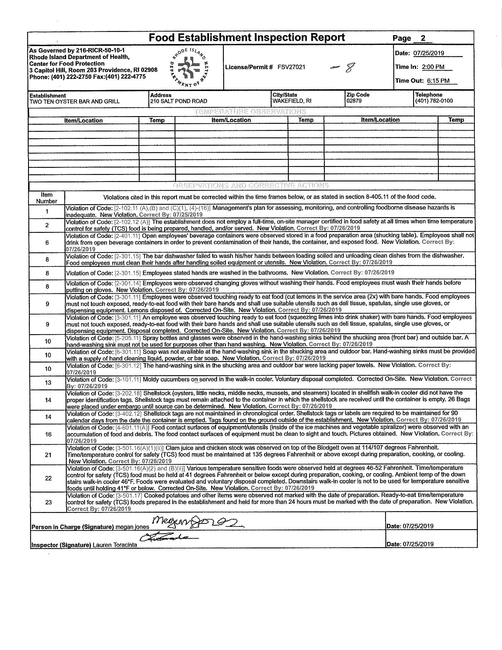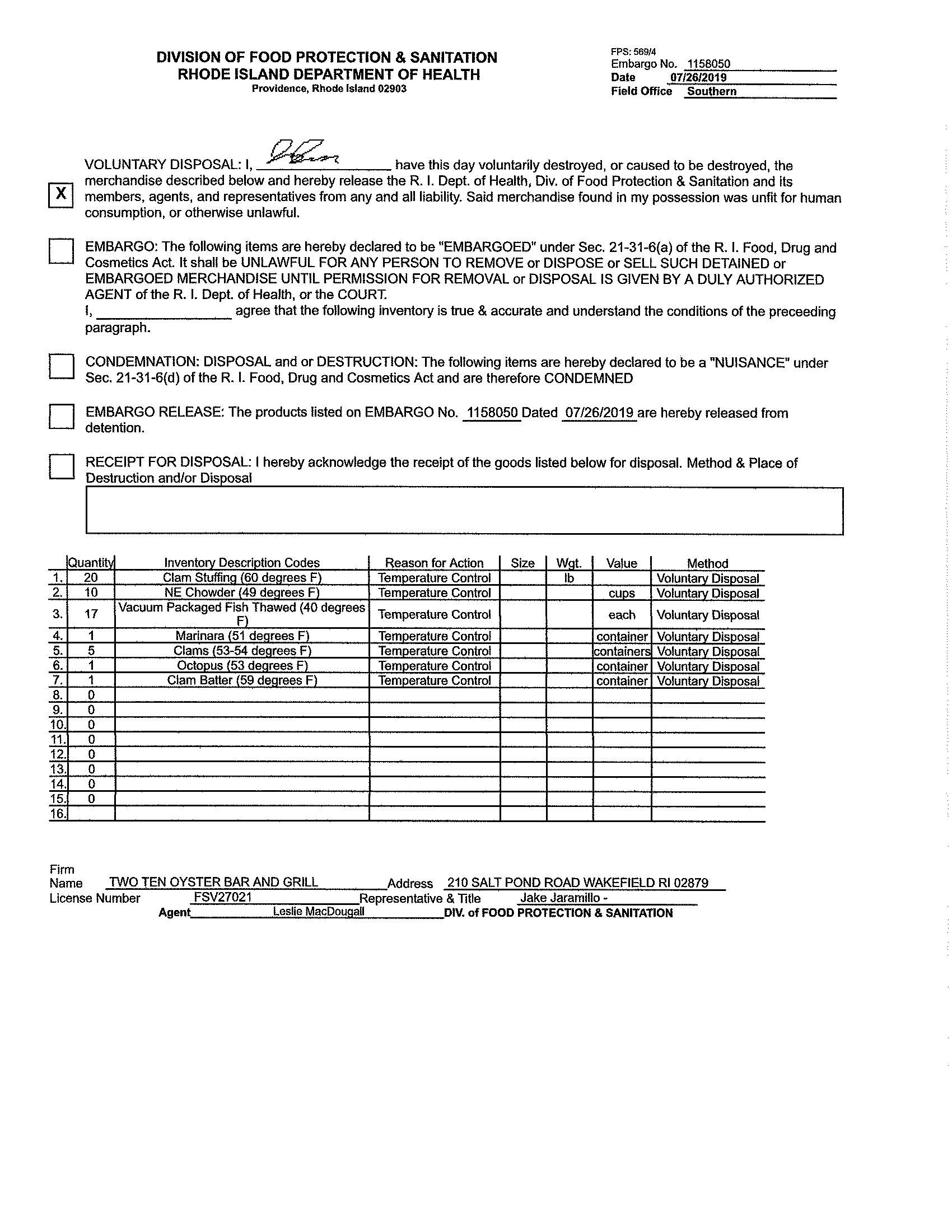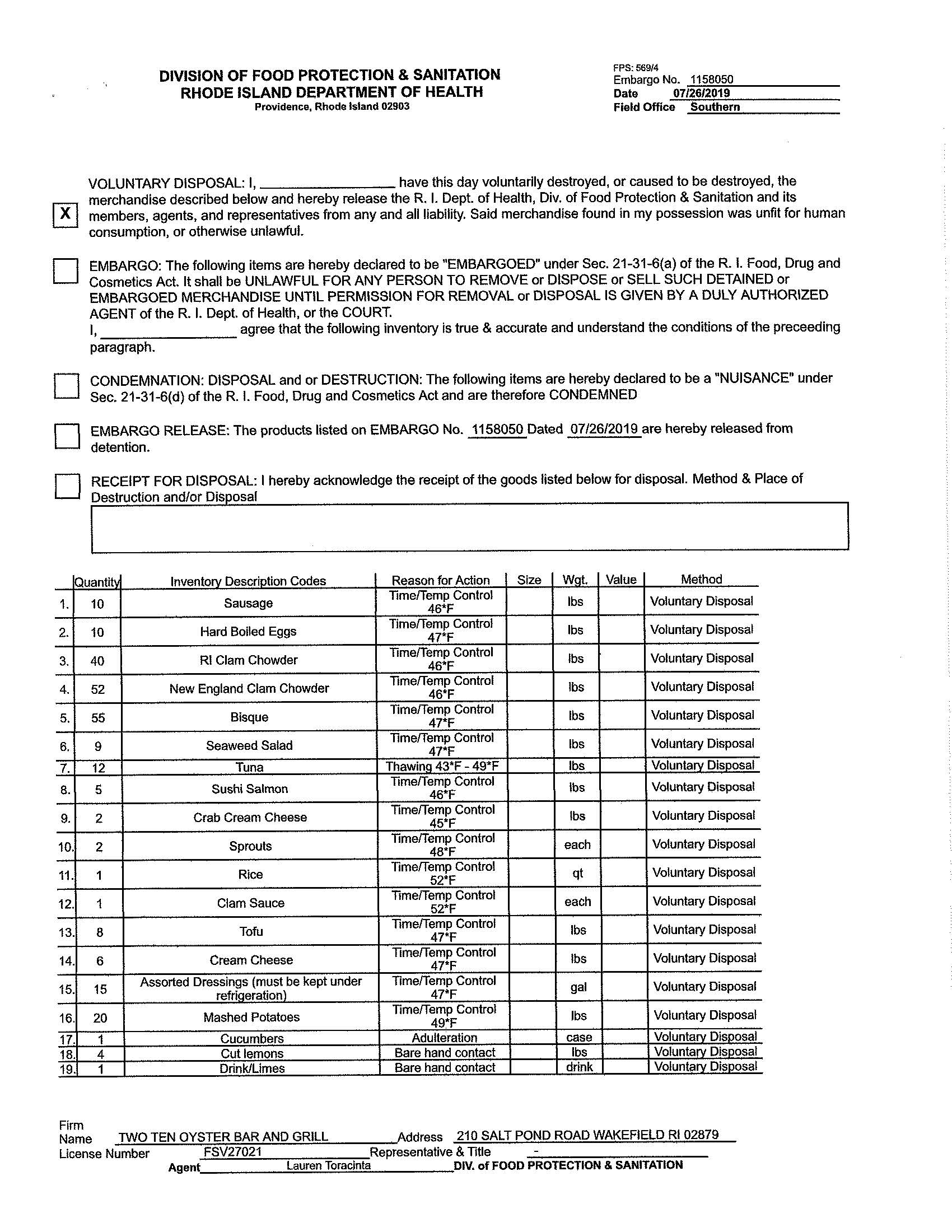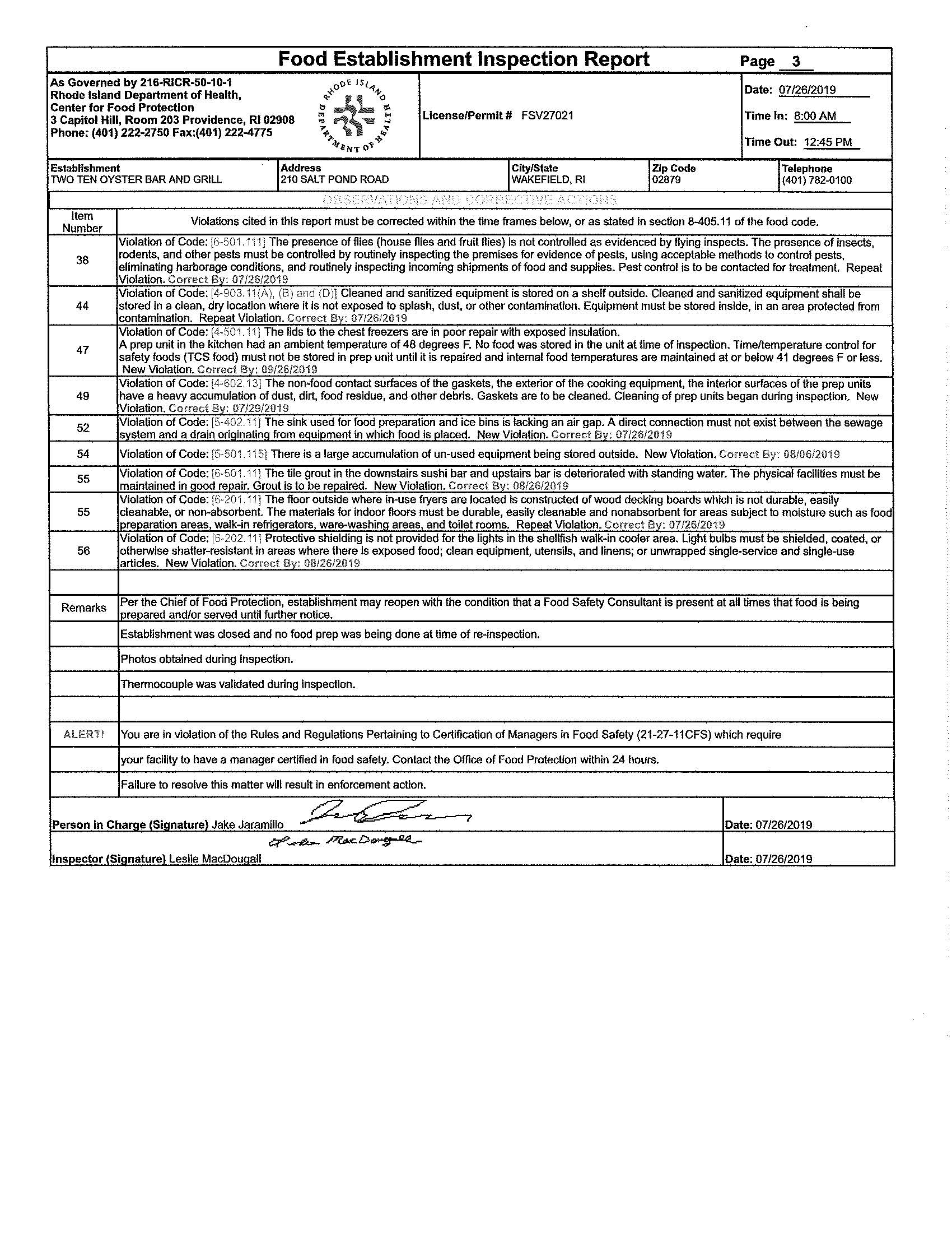 TwoTen Oyster Bar & Grill in South Kingstown closed down temporarily following a Rhode Island Department of Health inspection that found multiple violations, including the presence of flies -- and a violation of the "Rules and Regulations Pertaining to Certification of Managers in Food Safety" which require a facility to have a manager certified in food safety.