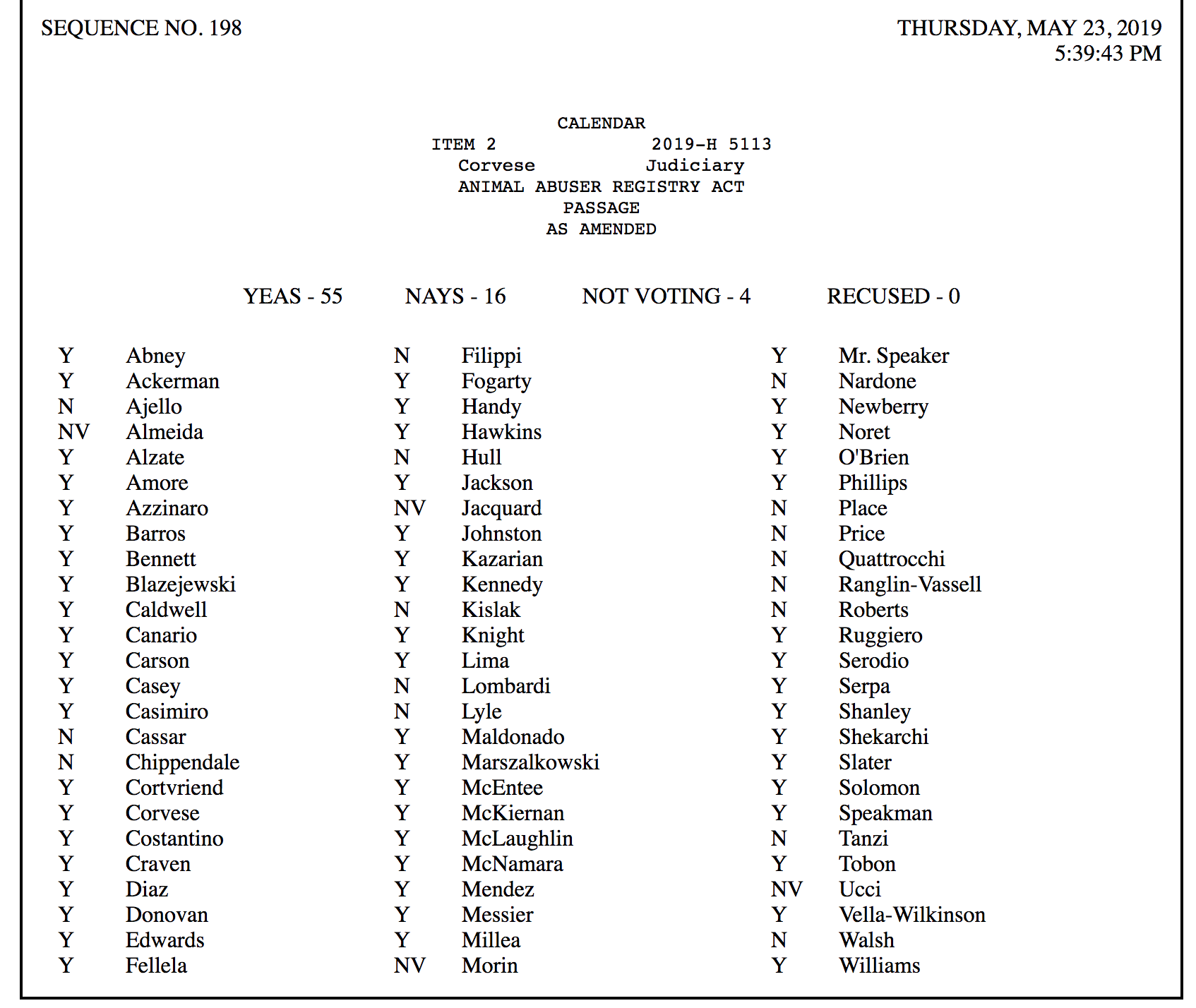 An amended version of the bill passed with 55 Representatives voting in favor, 16 opposed, and 4 not voting -- SEE VOTE COUNT BELOW
