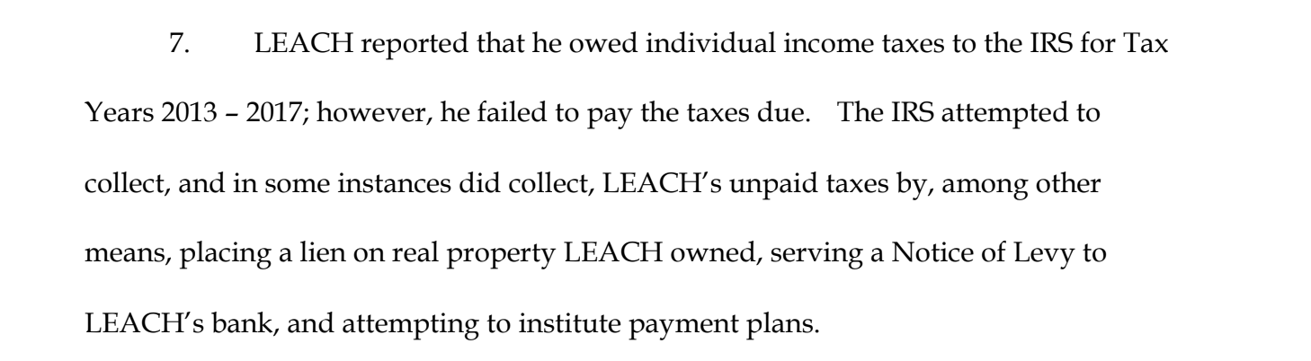 The lawsuit asserts that Leach failed to pay required taxes — and that Leach attempted to evade the IRS.