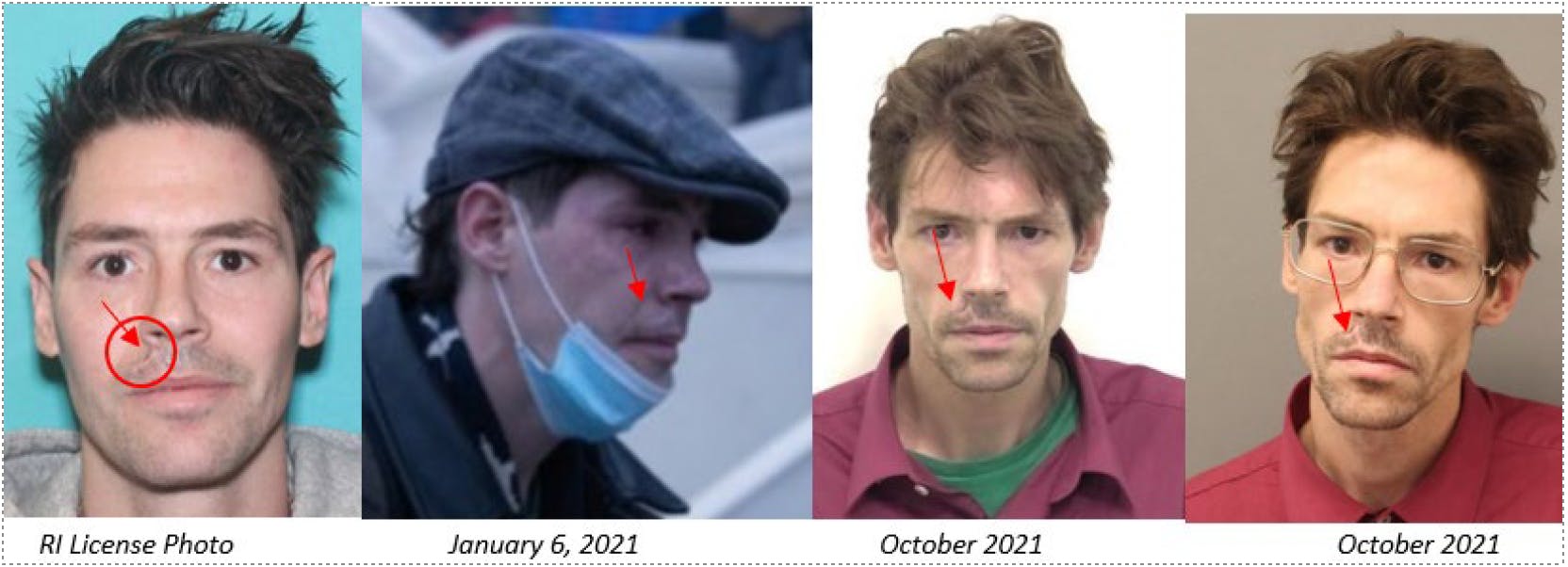 "A comparison of DESJARDINS face, as depicted in his Rhode Island driver’s license photograph, a photograph from January 6, 2021, and two mugshot photos from Providence Police Department and Adult Correctional Institute in October 2021, show a distinctive scar located on DESJARDINS’ right upper lip," stated the document.