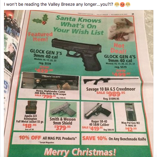 "I think it's very disturbing to have a full page ad promoting guns. It turns my stomach and I will never pick up that paper," said one Facebook user, who wished only to be identified as "Laurie" due to the controversial nature of the post.
