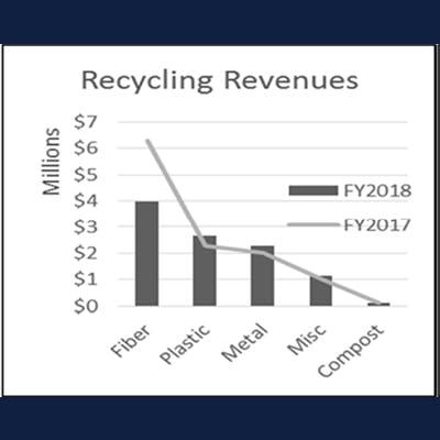 “Recycling revenues decreased by $1.6M to $10.2M. Fiber decreased by $2.3M to $4M,…Prices for commodities remained depressed for FY2018 since their significant decline approximately three years ago. China’s ‘National Sword’ policy set a much tougher standard for contamination of a 0.5 percent contamination limit which went into effect 3/1/18,” said the audit.