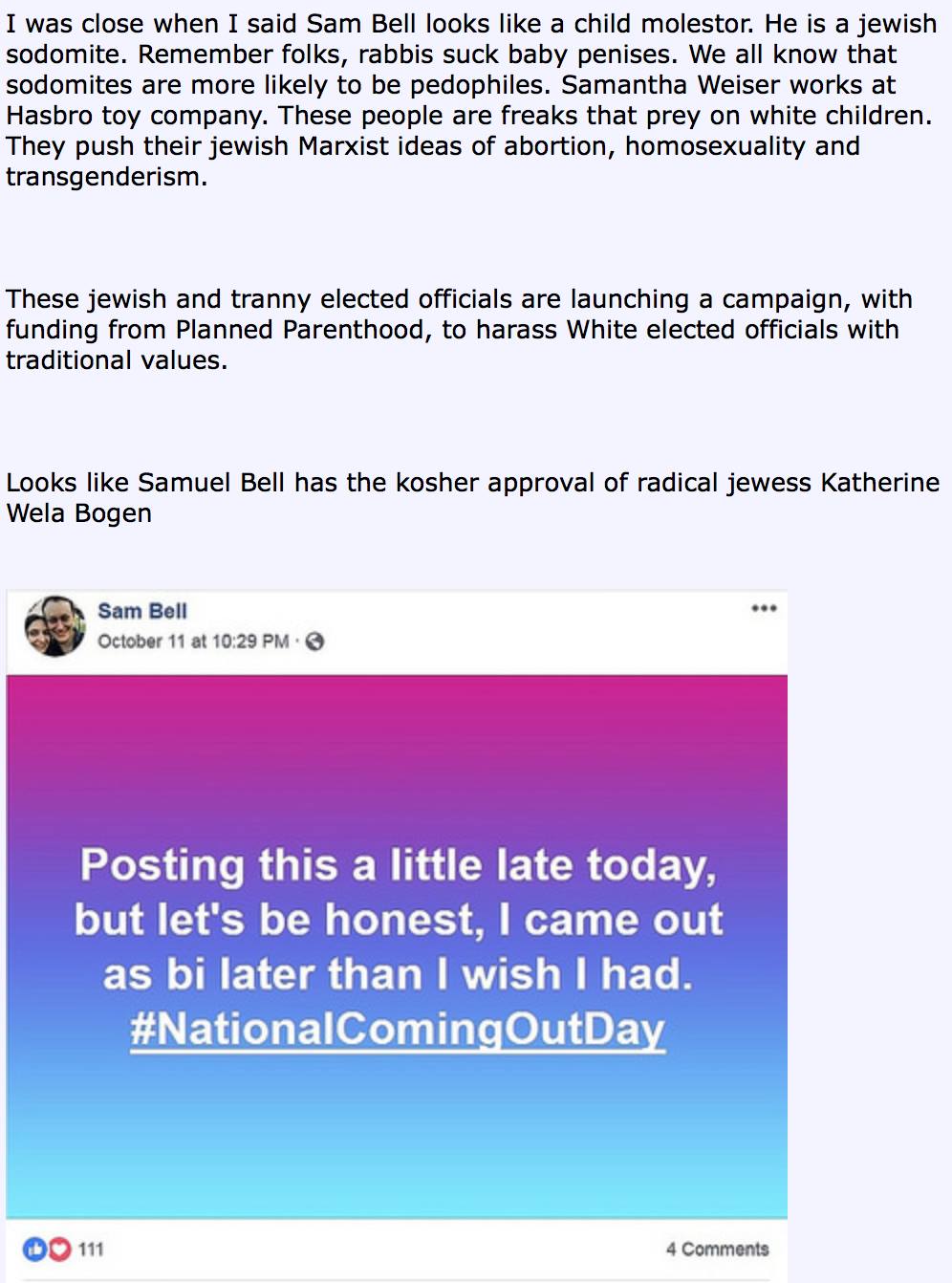 “The NeoNazi website Stormfront has started a thread featuring me and Samantha. They don't like that we identify as Jewish and bisexual, and they have truly gross things to say. They also make absolutely disgusting comments about my friend Mel DuPont. An activist and constituent who has been the subject of revolting online harassment from NeoNazis, Katherine Wela Bogen, was mentioned in it, and she alerted us to this thread. Katherine and Mel both told us they were okay with being identified here, and we would like to thank them for both their bravery and their activism,” wrote Bell.