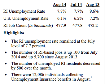 The RI Department of Labor and Training announced that the state’s seasonally adjusted unemployment rate for August 2014 remained at 7.7 percent, unchanged from the July 2014 rate.