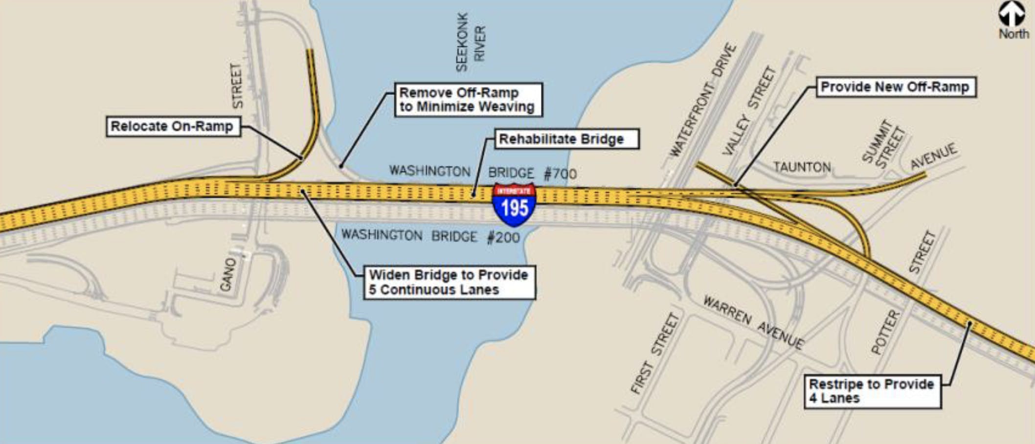 “The ramp is connected to the Washington Bridge project, which is addressing the substructure of the bridge. And the proposed improvements involve reconfiguring the off-ramp to serve as a new on-ramp from Gano Street to I-195 West. Many of the updated substructure elements would be used in the new ramp,” said St. Martin.
