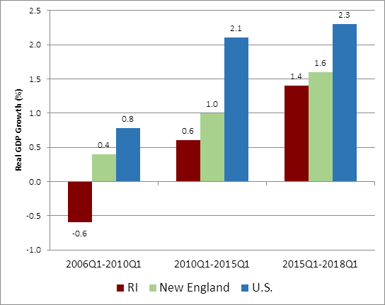 “Rhode Island’s slow economic growth is not a recent phenomenon, but rather the norm over the last two decades. While economic growth has accelerated across the nation, Rhode Island’s rate of growth has been slower than that of the New England region and the national average,” said Tebaldi.