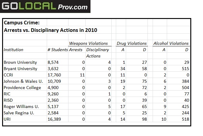 Across the board, schools chose to discipline students internally rather than have them arrested for drug and alcohol violations. For example, just one Brown student was arrested for a drug violation in 2010, while 27 students were disciplined for drug violations and 29 were disciplined for violations of liquor laws. The University of Rhode Island recorded 518 disciplinary actions for alcohol and only ten arrests in 2010.