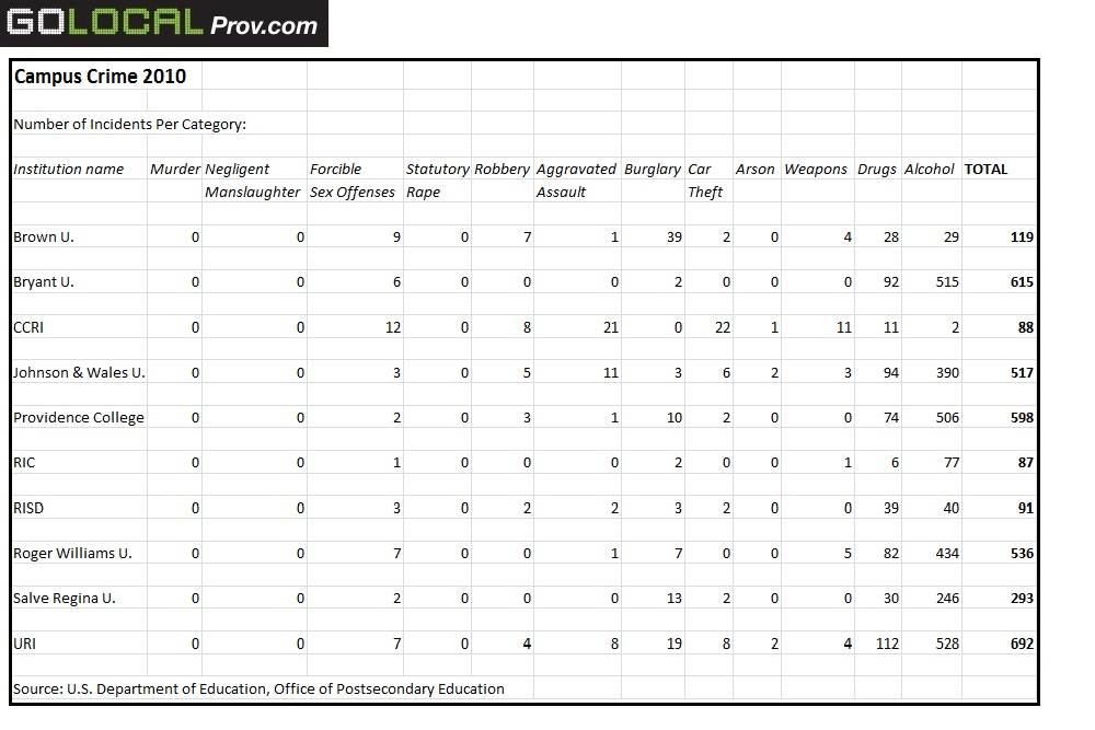 The numbers tallied by GoLocalProv include cases where a student was disciplined for alcohol and drug activity that violated the law. In fact, the bulk of criminal activity on all the campuses surveyed resulted from substance abuse, with most other criminal activity keeping to a minimum.