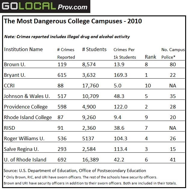 When the number of crimes reported was compared to the size of the student population, Bryant University rose to the top, followed by Providence College, Salve Regina University, and Roger Williams University.