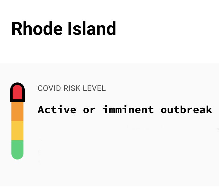 Rhode Island is the only “Active or imminent outbreak” state on the entire East Coast, according to Covid ActNow. One would have to travel west and south to Kentucky to find a state at the same highest risk level.
