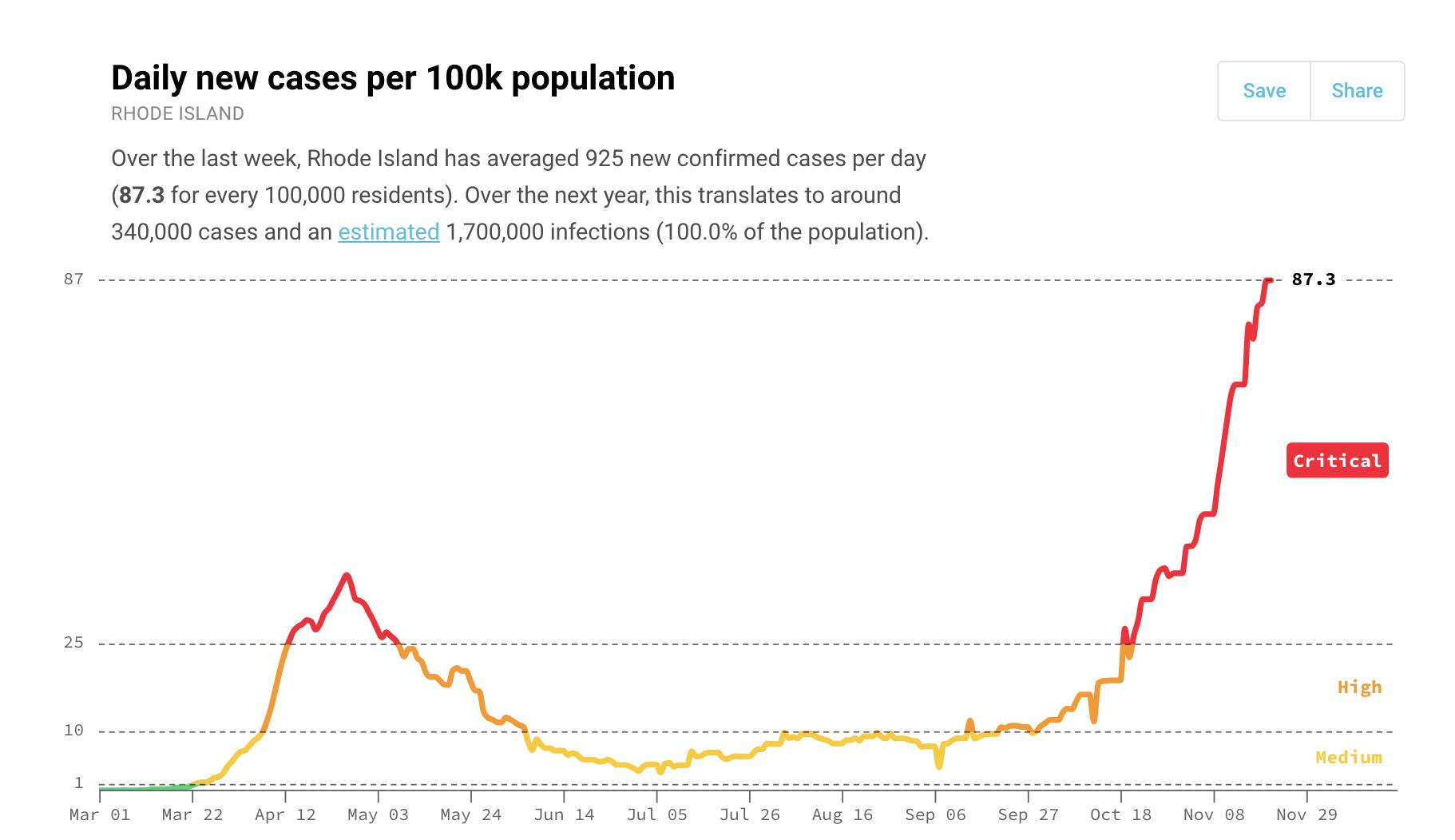 The graphic by covidactnow.org, experts from Georgetown University, Stamford University, and the Harvard Global Health Institute, now forecasts 1.7 million infections in Rhode Island over the next year. In a state with a population of just over a million. Let that sink in for a minute. Unless some radical changes are made, it’s predicted that everyone in Rhode Island will become infected with the coronavirus.
