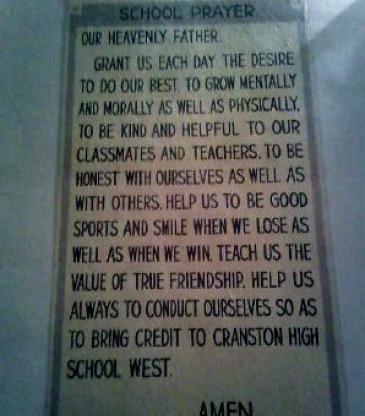 Description: In 2010, the Rhode Island ACLU contacted the Cranston School District, alerting it to a complaint it had received from a parent about a prayer banner in the auditorium at Cranston West High School, which the ACLU said was a clear violation of First Amendment rights and case law on school prayer. The prayer petitions “Our Heavenly Father” for kindness, honesty, friendship, and sportsmanship among students. When the school did not take down the banner, Jessica Ahlquist, a student at Cranston West High School, sued in 2011. Ahlquist eventually prevailed in court and the banner had to be taken down.