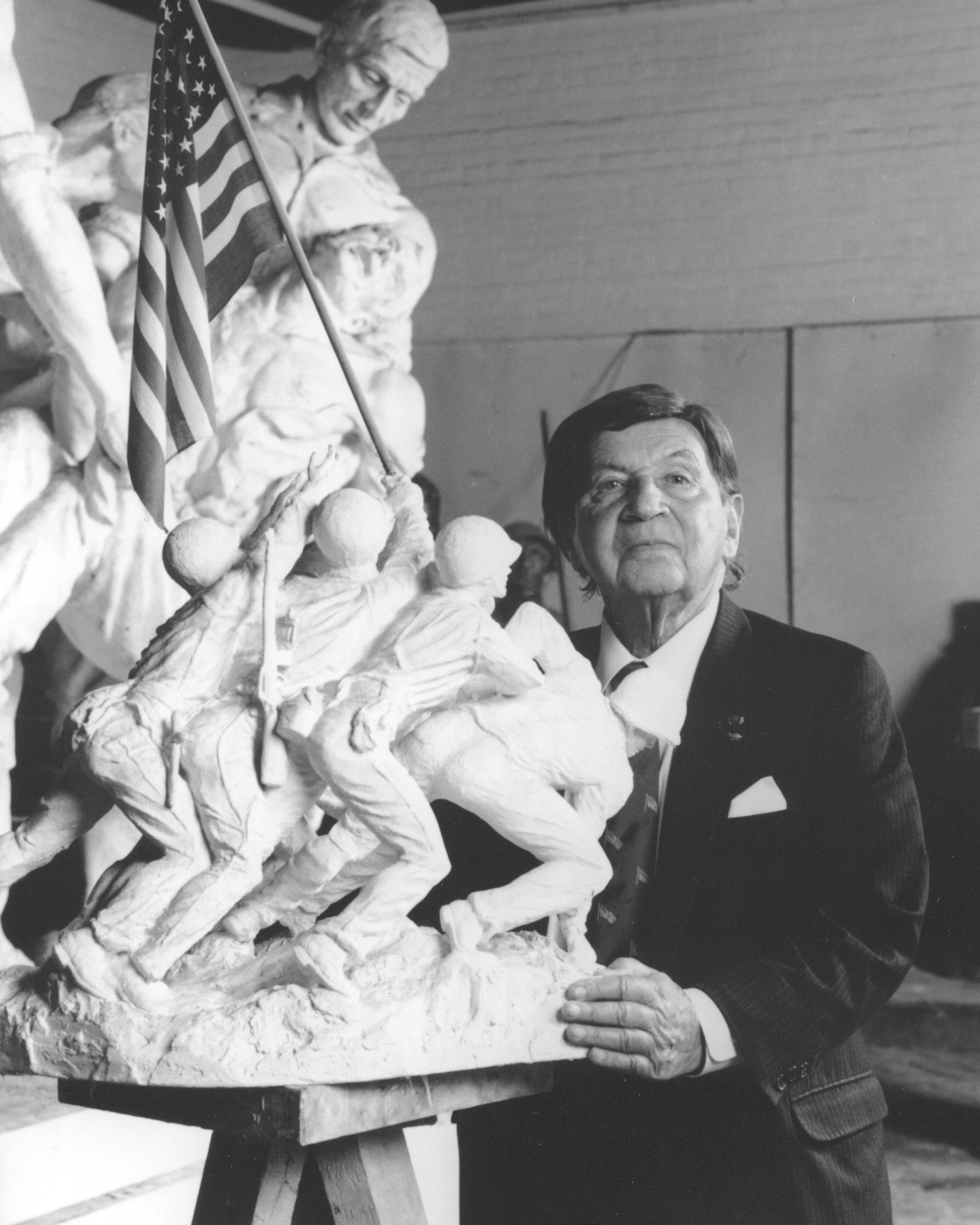 In 1950, while still working on the Iwo Jima monument, de Weldon was tapped by President Harry Truman to serve as Commissioner of Fine Arts. He would go on to hold this position under five presidents. De Weldon also made busts of three U.S. Presidents. Here he is pictured with one he did for Truman.