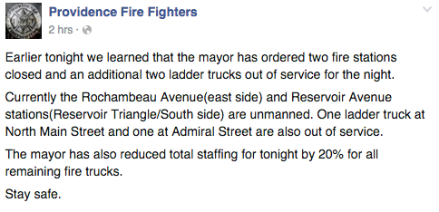 According to Derek Silva, Vice President of International Association of Firefighters, Local 799, the city was going to be closing the fire stations located at Rochambeau Avenue and Reservoir Avenue, but less than an hour later Silva updated GoLocal because the City of Providence was changing the closing plan again.