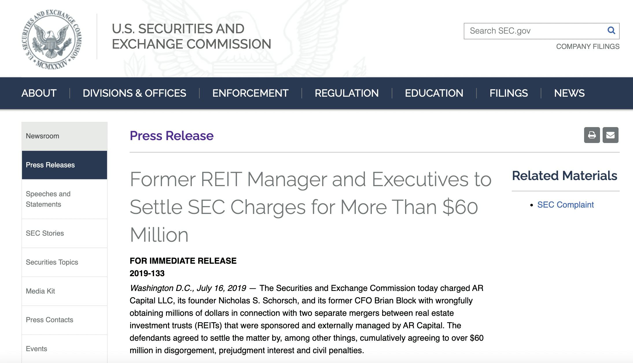"REIT managers and their professionals have an obligation to tell the truth when making disclosures to shareholders about their compensation," said Marc P. Berger, Director of the SEC's New York Regional Office. "As we allege in our complaint, AR Capital and its partners Schorsch and Block failed to do so and benefitted themselves greatly at the expense of shareholders."