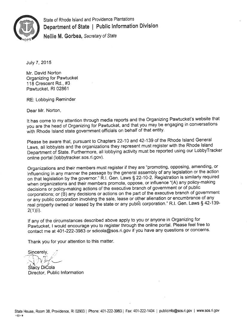 In contrast, a Pawtucket citizen's letter started with, "It has come to my attention through media reports and the Organizing Pawtucket website that you are the head of Organizing for Pawtucket, and that you may be engaging in conversation with Rhode Island state government officials on behalf of that entity."