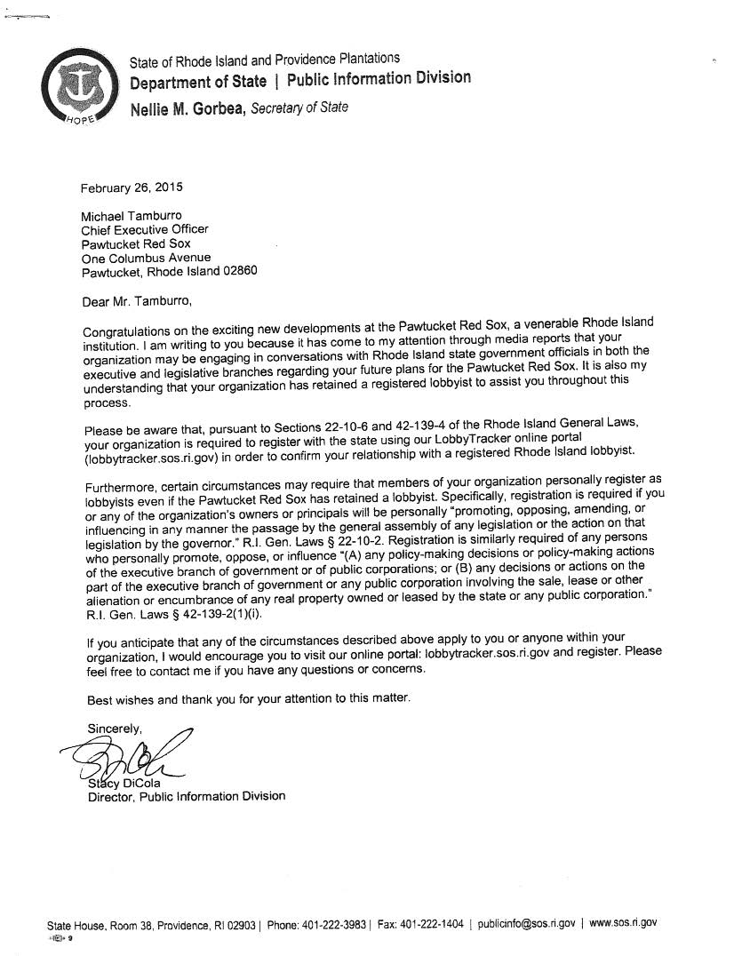 A letter sent to Pawtucket Red Sox Chief Executive Officer Michael Tamburro, outlining the state's lobbying statute, began with, "Congratulations on the exciting new developments at the Pawtucket Red Sox, a venerable Rhode Island Institution."