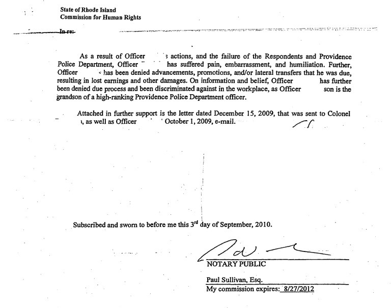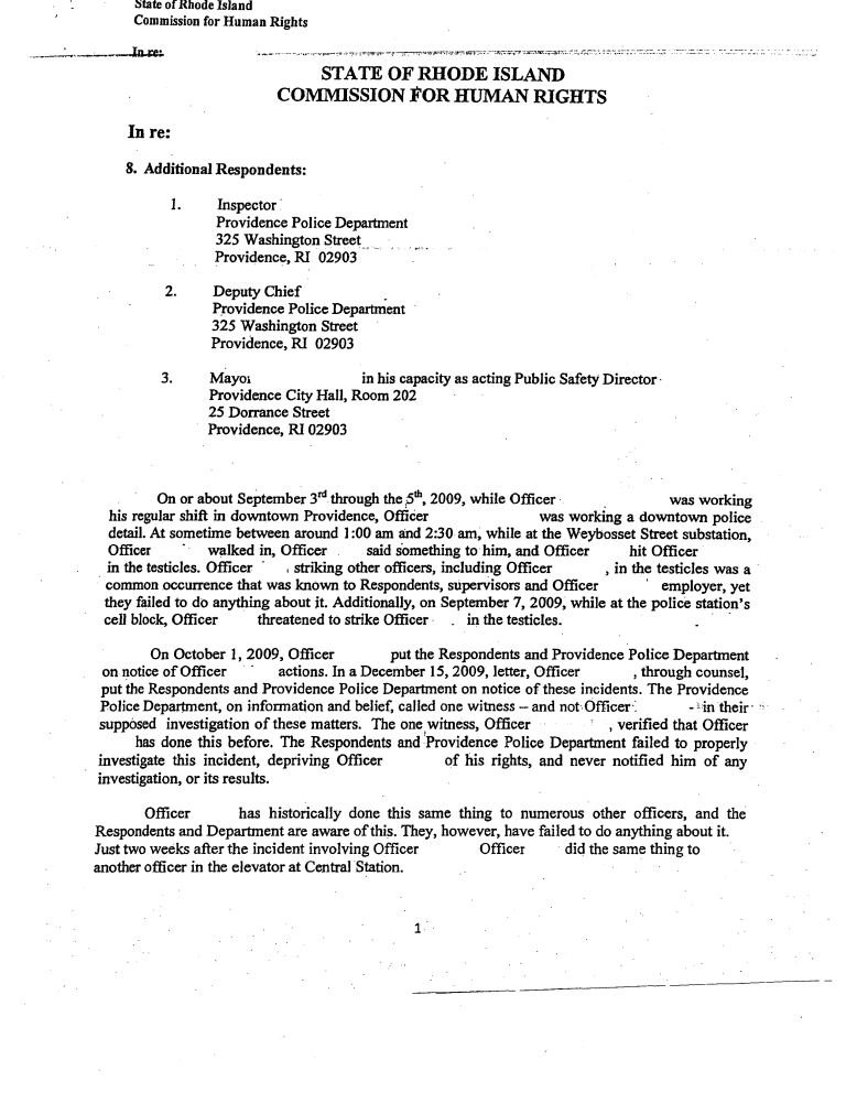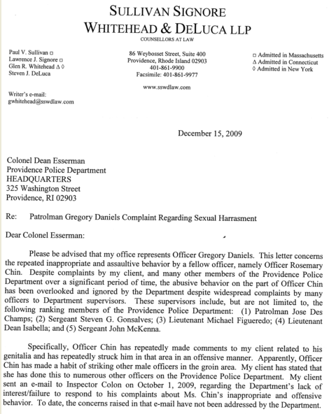 Below is a copy of the Sept. 3 complaint filed with the state Human Right Commission, in which a female officer at the Providence Police Department is accused of sexually harassing other male officers. The name of the female officer and the name of the male officer making the accusation are redacted from this version of the complaint, which is on file at Providence County Superior Court. However, they are identified as Rosemary Chin and Gregory Daniels in a Dec. 15, 2009 letter from an attorney representing Daniels, which is also provided below. (Click here to read about the case.)